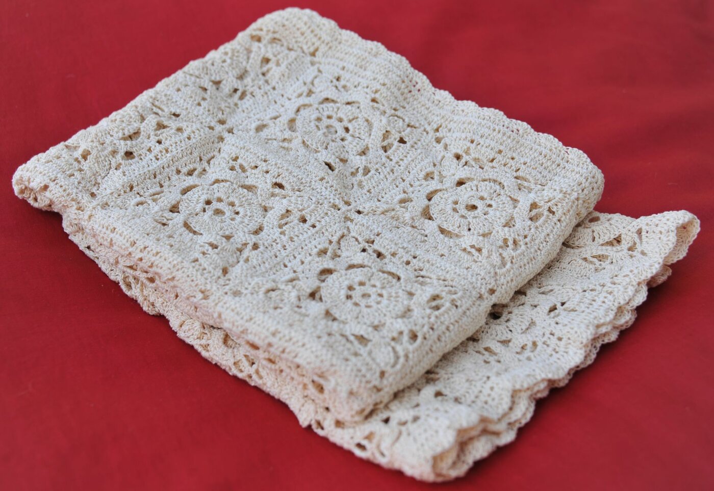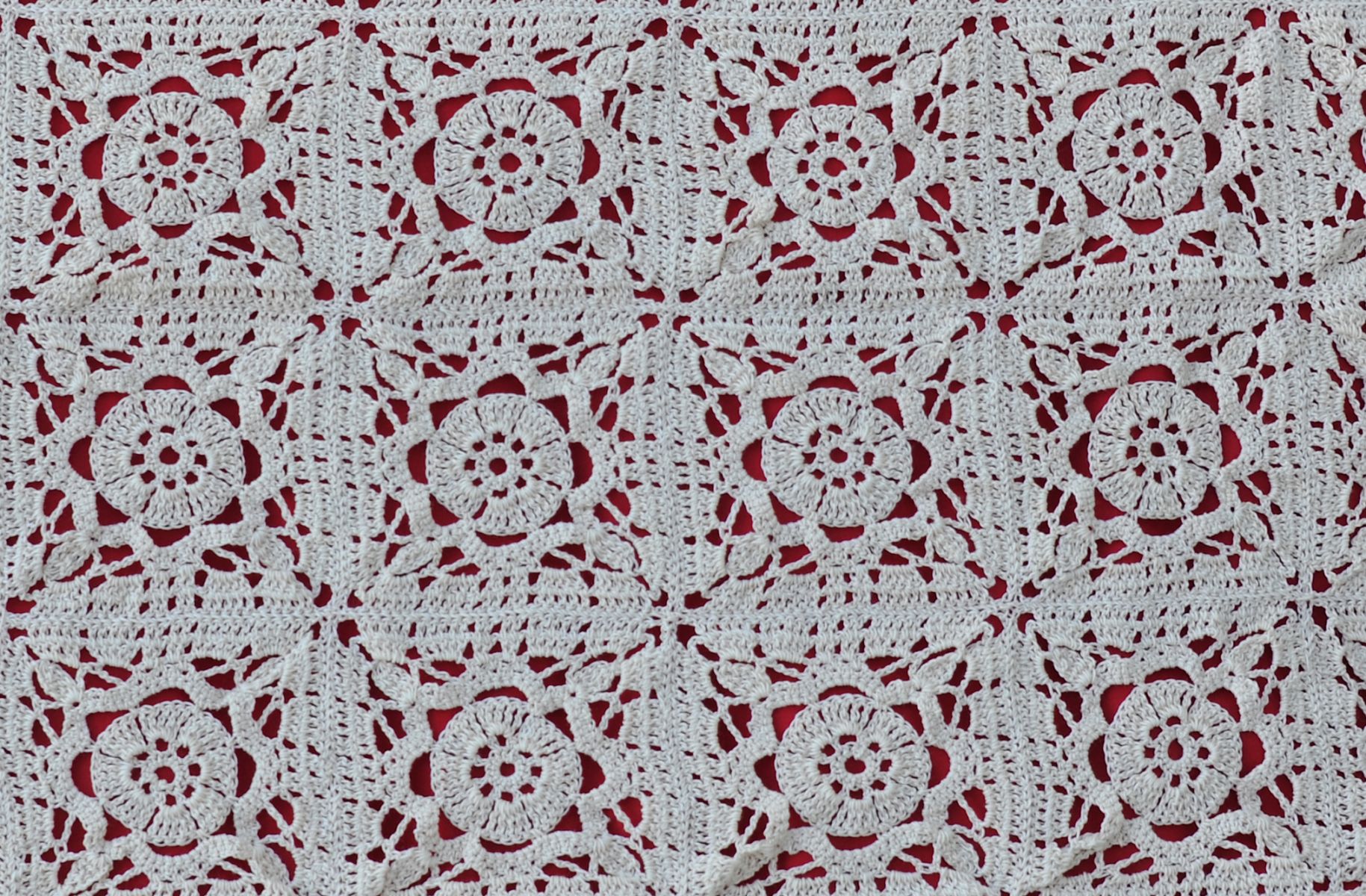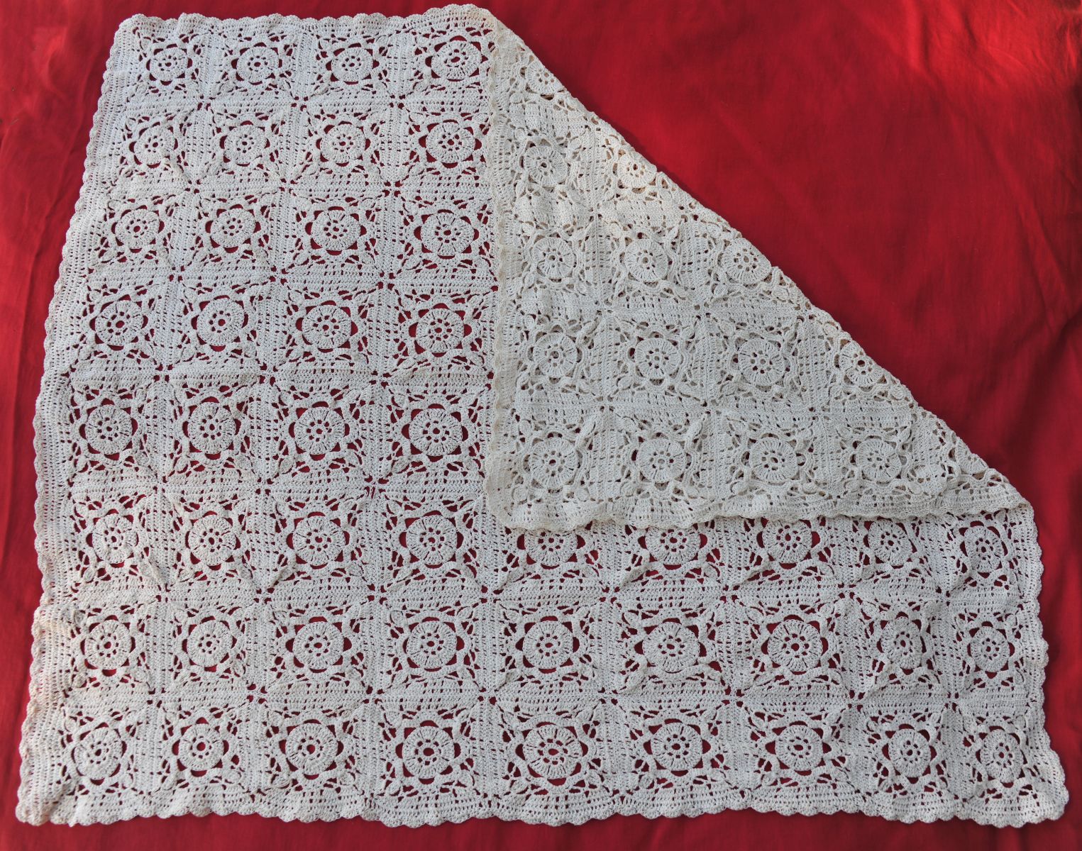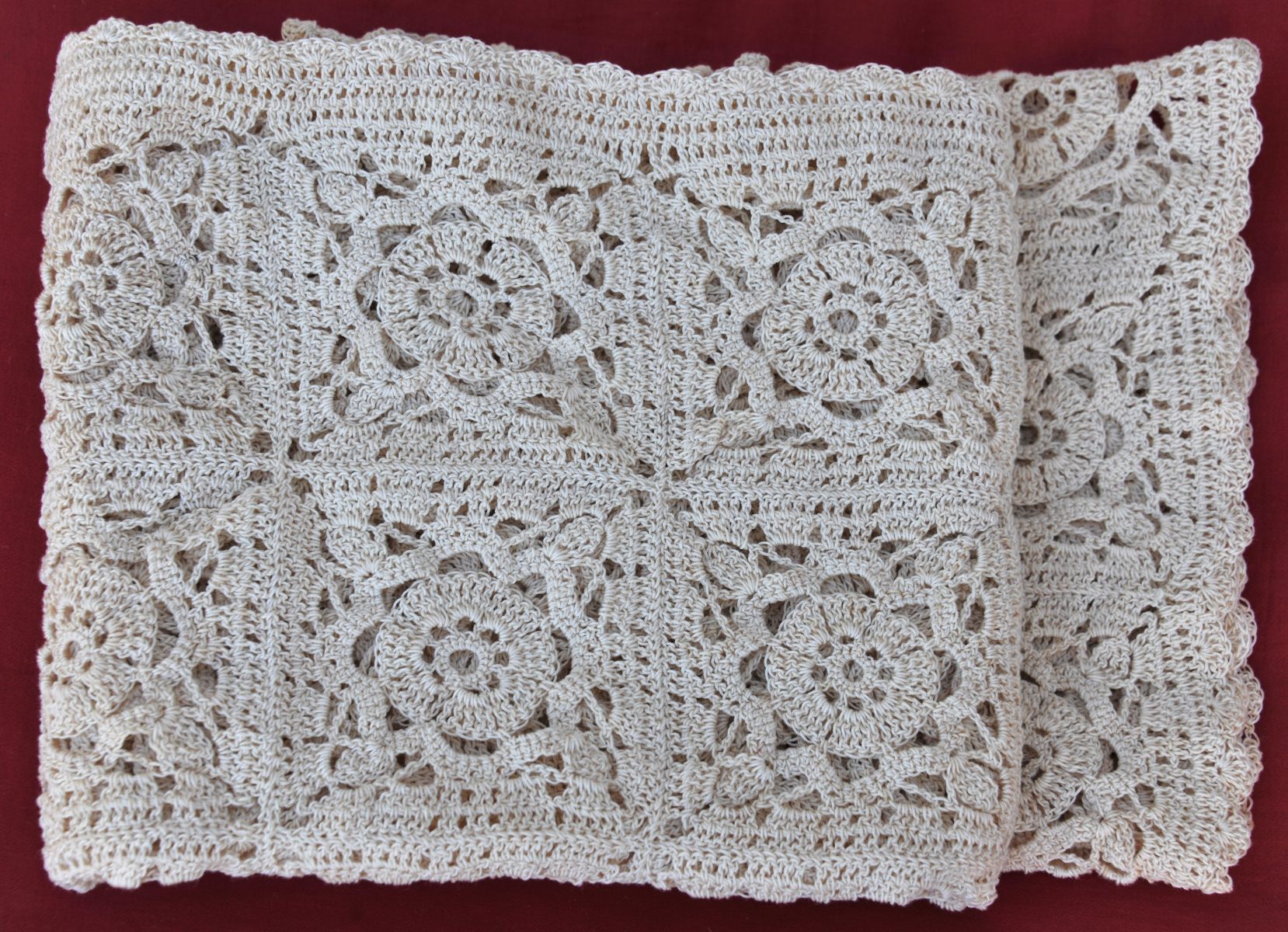 Ouvrage d’art réalisé avec un fil très fin de dentelle, composés de carrés grany assemblés avec une bordure feston de finition.