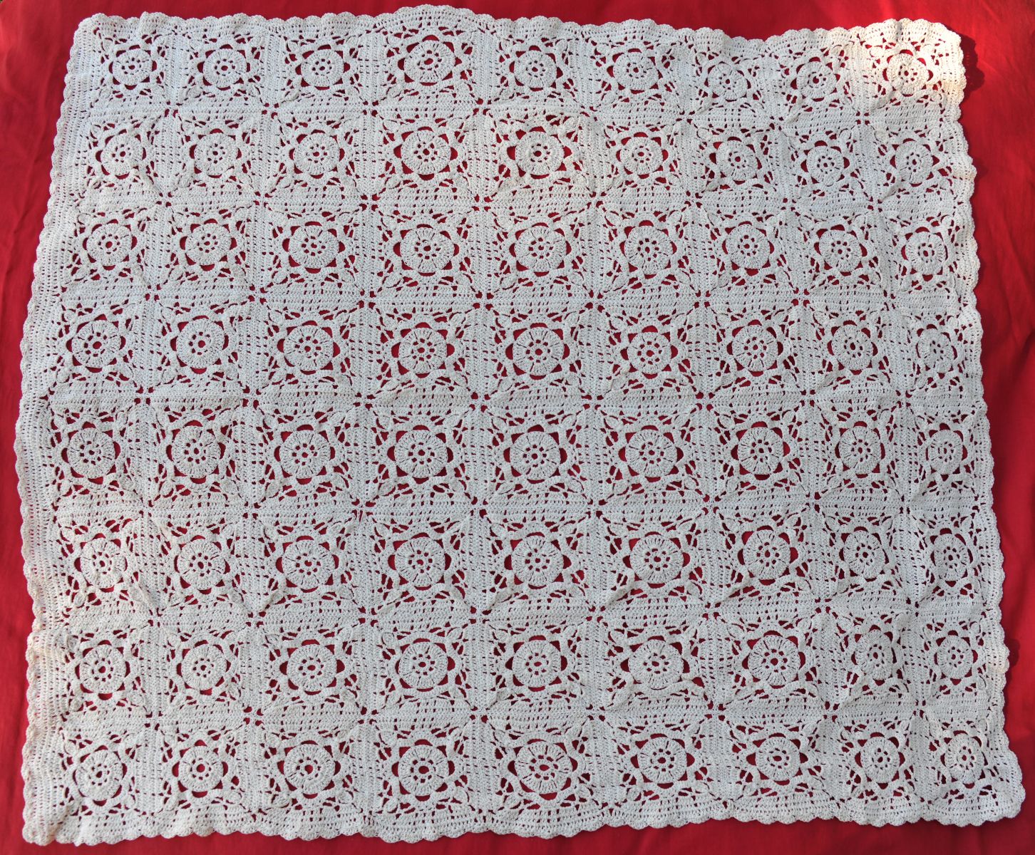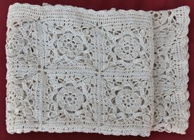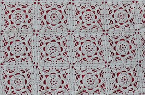 Ouvrage d’art réalisé avec un fil très fin de dentelle, composés de carrés grany assemblés avec une bordure feston de finition.